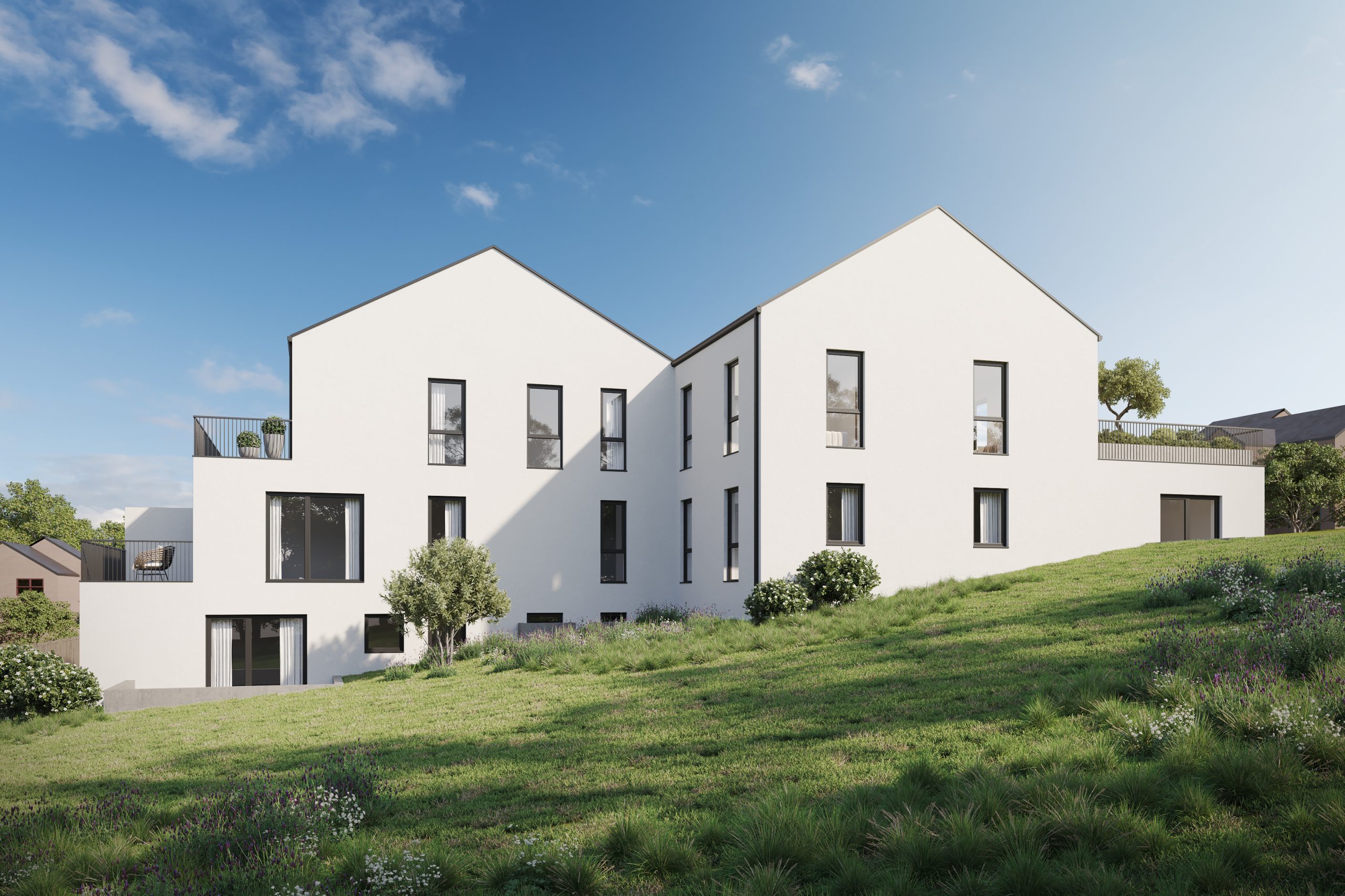 Für energieeffizientes Wohnungen sorgt eine moderne Fußbodenheizung mit Erdwärmebohrung und integrierter Kühlfunktion, eine separate Lüftungsanlage für jede Wohnung sowie eine PV-Anlage mit zentralem Batteriespeicher.